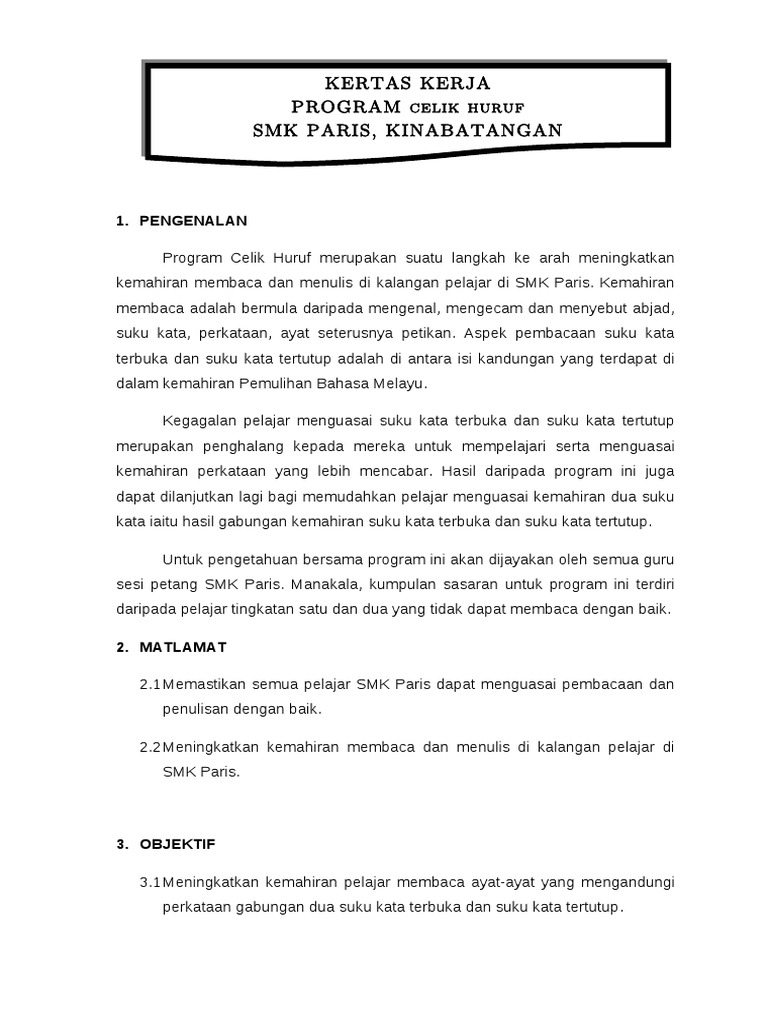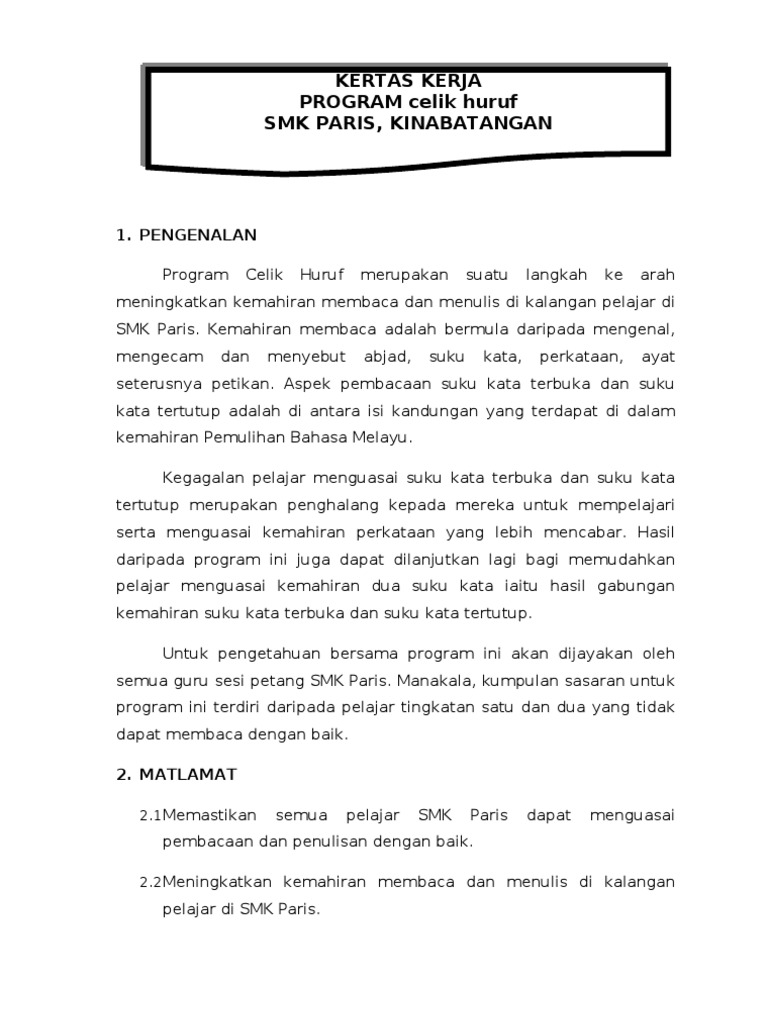 Contoh Kertas Kerja Bijak Membaca Pemulihan Khas By Jo_Elizabeth617 14 Jun 2022 Post a Comment Nilai Murni Bertindak bijak Ilmu Pendidikan Kesihatan Strategi P P. Kertas kerja program sentuhan kasih kelompok 1 2015. Buku Lembaran Kerja Bahasa Melayu dan Matematik Program Pemulihan Khas 2012.